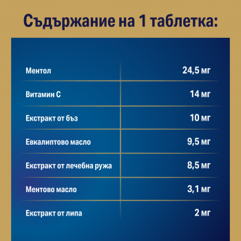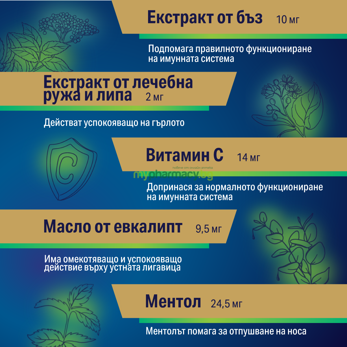 Захар; глюкозен сироп; ментол на кристали; витамин C/L-аскорбинова киселина; екстракт от плод на бъз (Sambucus nigra L.)*; Етерично масло от евкалипт (Eucalyptus globulus); екстракт от корени на лечебна ружа (Althaea officinalis L.)*; етерично масло от полска мента (Mentha arvensis); екстракт от цветове на липа (Tilia vulgaris L.)*. (*сухи хидроалкохолни екстракти 4:1)