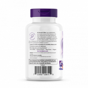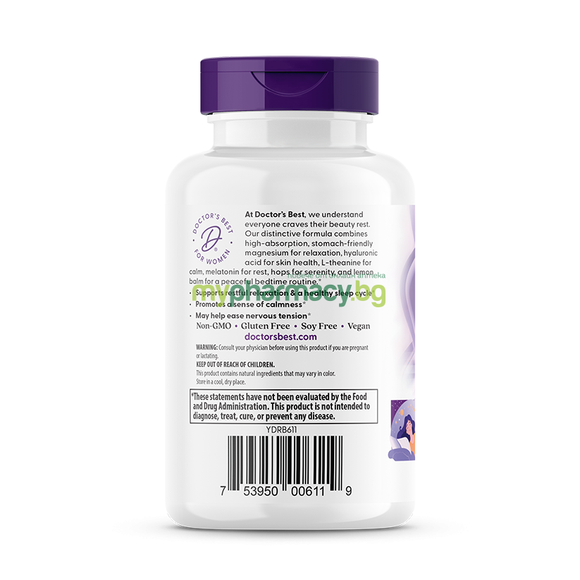 Doctor's Best Women's Beauty Sleep е иновативна формула, създадена да осигури пълноценна почивка и възстановяване през нощта. Тя комбинира високоусвоим магнезий (лиринат глицинат хелат) за мускулна релаксация, L-теанин за спокойствие и мелатонин за регулиране на съня. Добавените екстракти от хмел и маточина успокояват нервната система, а хиалуроновата киселина се грижи за хидратацията на кожата докато спите. Този продукт подкрепя не само качествения сън, но и красотата отвътре навън.