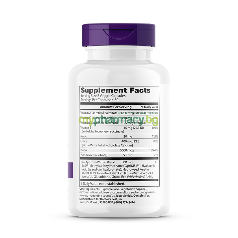 Doctor's Best Women's Hair, Skin & Nails е комплексна формула, създадена да отключи естественото сияние отвътре навън. Тя съдържа OptiMSM® (метилсулфонилметан), хидролизиран кератин и хиалуронова киселина, които са ключови за производството на колаген и поддържането на структурата на кожата, косата и ноктите. Добавените витамини от група B (Биотин), Витамин С и цинк осигуряват мощна антиоксидантна защита и подхранване на клетъчно ниво. Продуктът помага за заздравяване на ноктите, сгъстяване на косата и подобряване на еластичността на кожата.