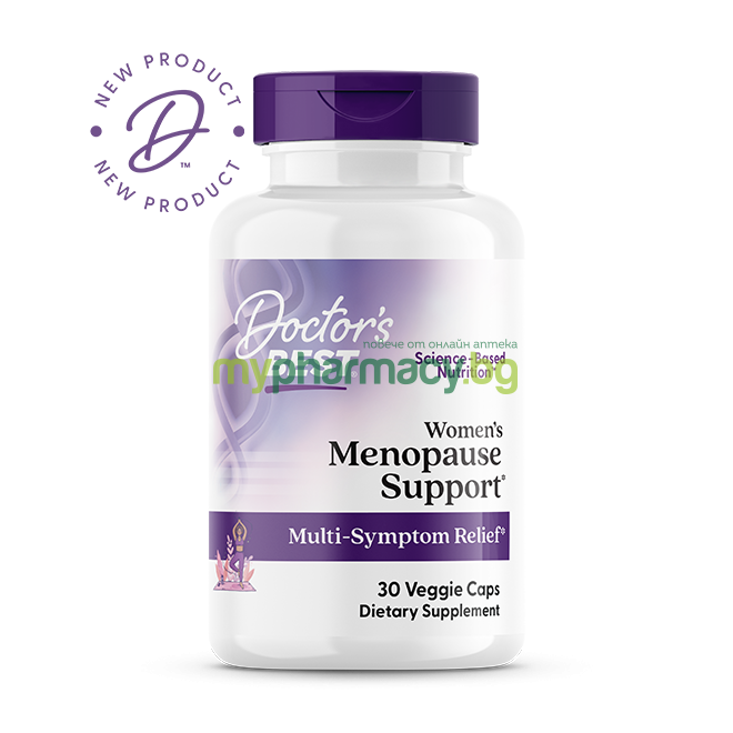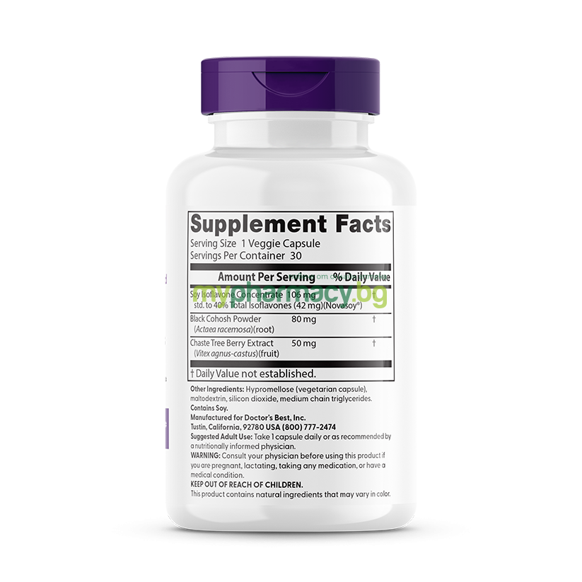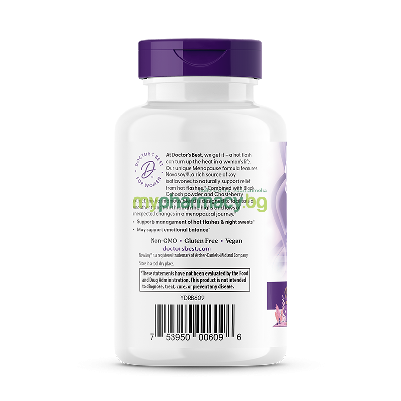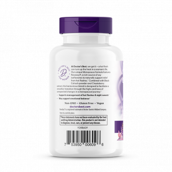 Doctor's Best Women's Menopause Support е научно обоснована формула, създадена да подпомогне жените в периода на менопауза. Продуктът съдържа Novasoy® – богат източник на соеви изофлавони, които естествено облекчават горещите вълни. Комбинацията е подсилена с екстракт от черен кохош и витекс (Chasteberry), които работят в синергия за балансиране на емоционалното състояние и намаляване на нощните изпотявания. Тази добавка е проектирана да улесни прехода през менопаузата, като осигурява комфорт и стабилност. Продуктът е веган, без глутен и ГМО.