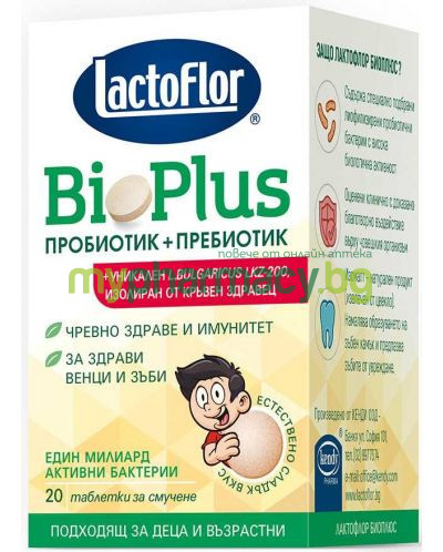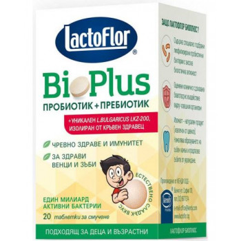 Lactoflor BioPlus таблетки са създадени като ежедневна подкрепа за имунната система и чревното здраве. Формулата комбинира пробиотици, пребиотик и изомалт, които подпомагат естествения микробиален баланс и създават условия за правилно функциониране на храносмилателната система. Уникалният щам Lactobacillus bulgaricus LKZ-200, изолиран от листа на кръвен здравец, допринася за поддържане на локалния имунитет, както и за общия комфорт в стомашно-чревния тракт. Продуктът е подходящ за деца и възрастни и може да се приема целогодишно като част от ежедневната профилактика.