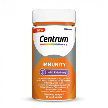 Centrum Immunity е специално разработена формула за цялостна подкрепа на имунната система, базирана на комбинация от ключови витамини, минерали и антиоксиданти. Съчетава мощното действие на витамините C, A, D, E, минералите цинк и селен, както и антиоксидантния потенциал на екстракт от черен бъз (Sambucus nigra). Тази комбинация подпомага естествените защитни механизми на организма, намалява риска от оксидативен стрес и поддържа нормалната функция на клетките, които участват в имунната реакция. Подходящ е за ежедневно приложение, особено през есенно-зимните месеци, периоди на интензивно натоварване или повишена заболеваемост.