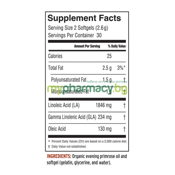 Други съставки: Масло от органична вечерна иглика; и софтгел (желатин, глицерин, вода и разтвор на сорбитол сорбитан). Без глутен и ГМО