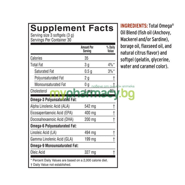 Пълноценен ултрапречистен продукт осигуряващ пълния спектър на Омега 3, 6 и 9 в синергична смес от ленено масло, рибно масло Fresh Catch® и чисто масло от семена от пореч - в удобството на удобна за приемане софтгел капсула.