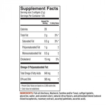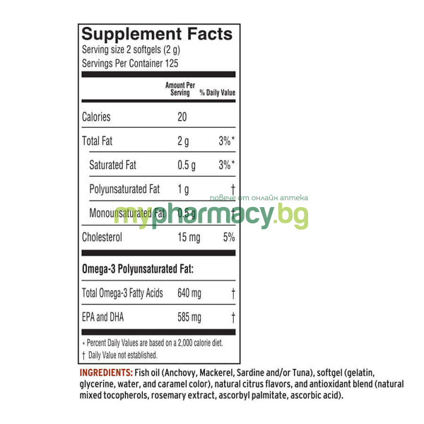 Други съставки: масло от аншоа, сардина, херингоподобни риби (borage oil), желатин, глицерин, цвят карамел, натурален цитрусов аромат, антиоксидантна бленда (лецитин от слънчоглед и соя, натурални токофероли, екстракт розмарин, аскорбинов палмитат, аскорбинова киселина и лимонена киселина).