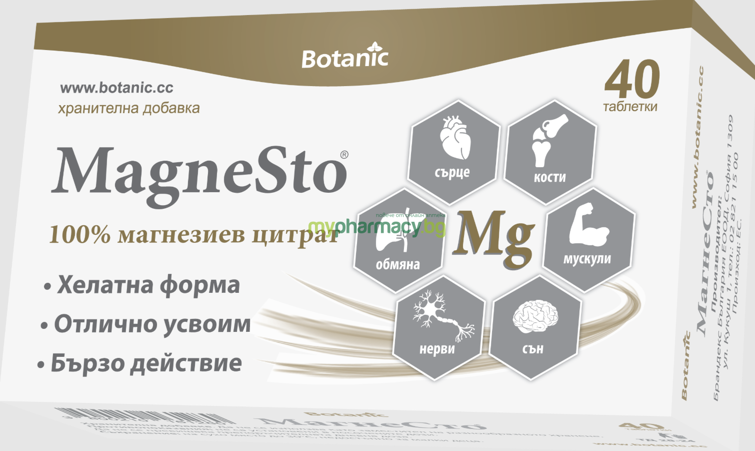 БОТАНИК МАГНЕСТО Магнезиев цитрат, е висококачествена натурална формула с 100% магнезиев цитрат – една от най-усвоимите органични форми на магнезия. Тази форма осигурява бързо навлизане в клетките, подкрепя енергийния метаболизъм, нервната система и мускулната функция. MagneSto подпомага както ежедневния тонус, така и нормалната психична функция, съня и възстановяването след напрежение и стрес. Формулата е чиста, без оцветители, консерванти и животински съставки, което я прави подходяща за хора, които търсят щадящо действие и висока биоактивност.