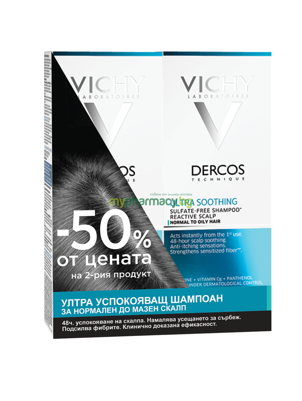 ВИШИ ДЕРКОС ПРОМО ПАКЕТ УЛТРА СЕНЗИТИВ ШАМПОАН / VICHY DERCOS ULTRA SOOTHING SHAMPOO Normal to Oily Hair успокояващo действие за чувствителен скалп за нормална и мазна коса шампоан 2х200мл