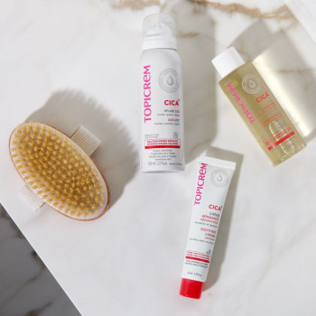 Topicrem CICA+ SOS Mist е иновативен спрей, който комбинира успокояващо, почистващо и регенериращо действие в една стъпка. Формулата му е базирана на патентован йонизиран разтвор, богат на минерални соли, който ефективно успокоява кожни раздразнения, зачервявания и усещане за парене. Спреят е специално разработен за чувствителна, раздразнена и увредена кожа, като подпомага възстановяването на епидермиса и укрепва кожната бариера. Благодарение на фината дифузия, нанасянето е безконтактно и хигиенично, което го прави идеален за болезнени зони. Продуктът е подходящ за цялото семейство, включително деца над 3 години, и може да се прилага върху лицето, тялото и лигавиците.