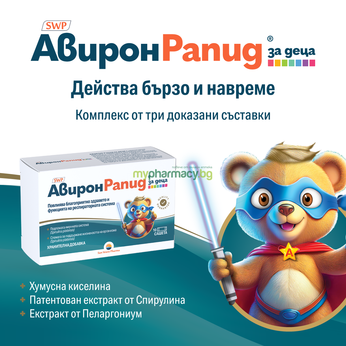 Авирон рапид под формата на сашета е предназначен за деца от 1 до 5 години. Съдържа комбинация от 3 съставки c натурален произход и допълващо се действие. Продуктът подпомага естествената защитна функция на организма и е особено подходящ за есенно-зимния сезон, когато рискът от респираторни инфекции е повишен.