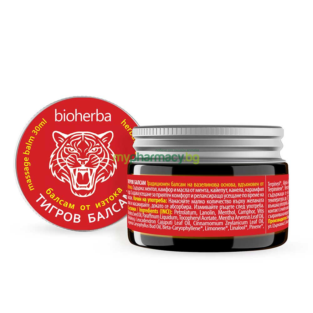Тигровият балсам на марката Биохерба е създаден по автентична източна рецепта за постигане на дълбок релакс и облекчение. Този концентриран масажен продукт съчетава силата на ментол и камфор с богат комплекс от етерични масла като канела, карамфил, мента и кайепут. При нанасяне върху кожата формулата осигурява първоначално приятно охлаждане, което плавно преминава в успокояващо затопляне. Балсамът е изключително ефективен при мускулно напрежение след спорт, главоболие, настинки или ухапвания от насекоми. Обогатен е с витамин Е и масло от гроздови семки за предпазване и подхранване на кожата по време на масажа.
