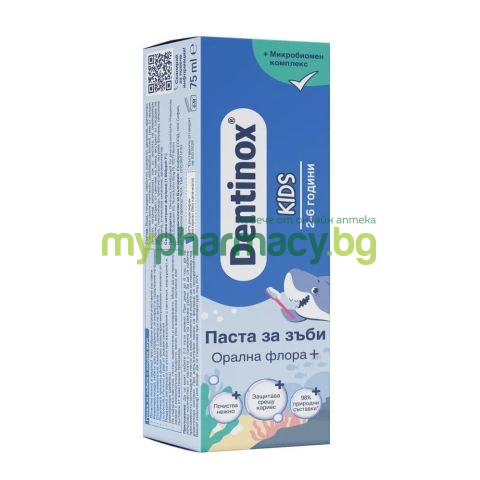 Dentinox Kids паста за зъби Орална флора+ е създадена за ежедневна орална грижа при деца, като осигурява ефективна защита срещу кариес и щадящо почистване на зъбите. Формулата е съобразена с нуждите на детската устна кухина и подпомага изграждането на добри хигиенни навици още от ранна възраст. Съдържанието на флуорид в подходяща концентрация подпомага реминерализацията на емайла и укрепва зъбите, като допринася за защита срещу кариес. Добавеният ксилитол съдейства за ограничаване развитието на кариесогенни бактерии и поддържа баланса в устната среда. Пастата почиства нежно благодарение на внимателно подбрани съставки, включително целулоза, която подпомага отстраняването на плаката, без да уврежда емайла. Формулата е обогатена с микробиомен комплекс от Lactobacillus ferment и смола от сенегалска акация, който подпомага поддържането на балансирана орална флора.